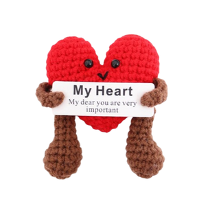 • Fill any space with love and positivity with this charming Positive Energy Doll in the shape of a heart. Handcrafted with care, this doll features a cheerful red heart with black eyes, a small smile,and brown crocheted arms and legs. The doll is holding a sign that reads, "My Heart. My dear, you are very important," reminding you and your loved one of the importance of self-worth and appreciation.